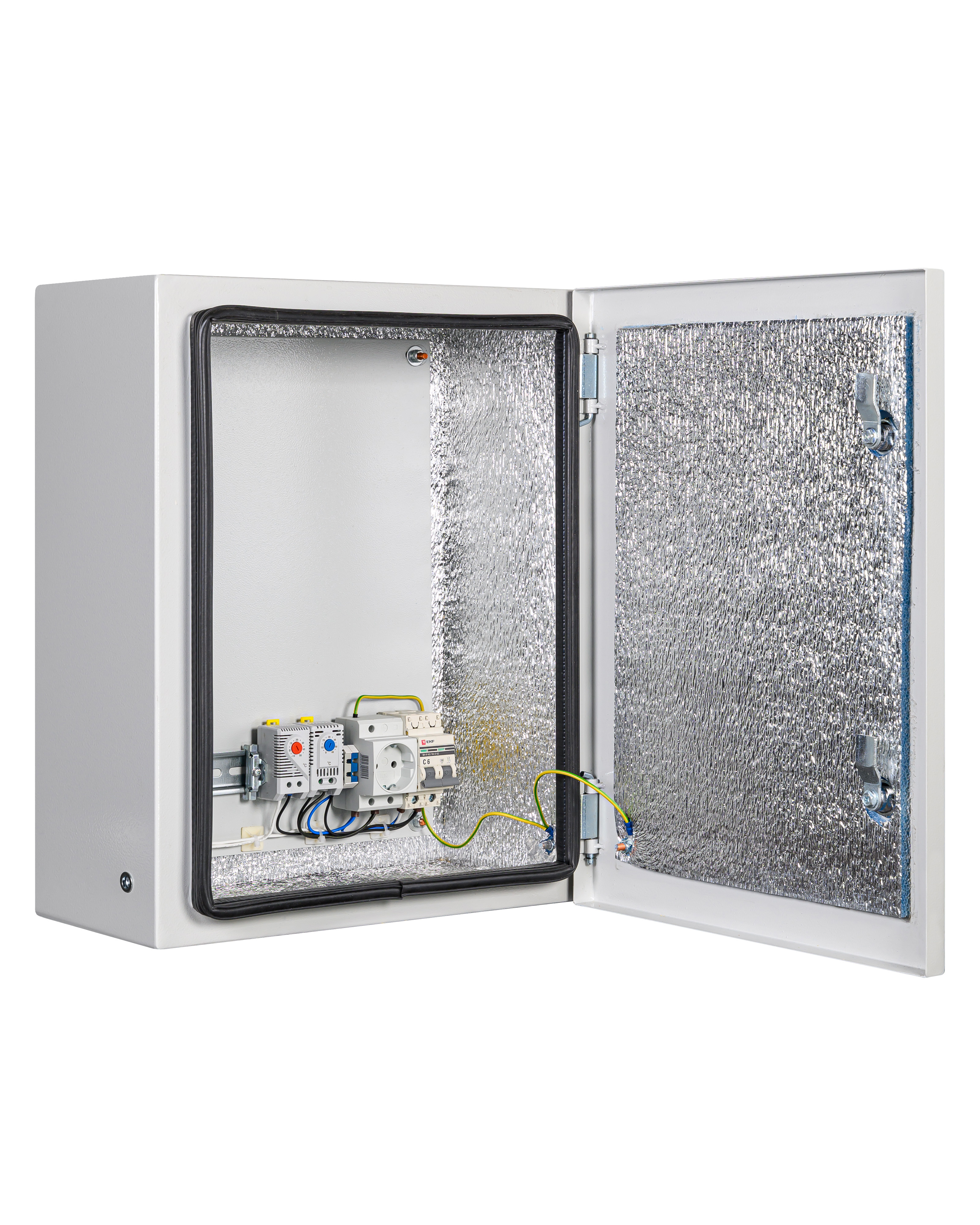 утеплитель из порилекса, замок 2 шт,ключ 1 шт, монтажная плата 1шт, гермовводы 2 шт (MG-25), розетка 1 шт, автоматический выключатель, 6А 1шт, клемма для подключения оборудования 2 шт, клемма заземления 1 шт, термореле 1шт, реле предстарта 1 шт, нагреватель мощностью 75 Вт 1шт.