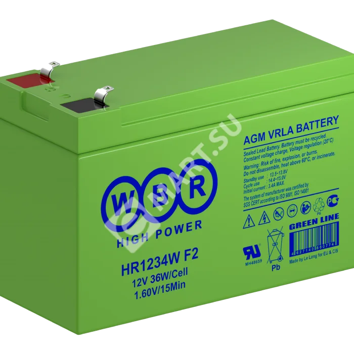 Аккумулятор WBR HR1234W F2 - герметизированная, выполненная по технологии AGM, аккумуляторная батарея общего применения со сроком службы до 8 лет в буферном режиме или 260 циклов заряда-разряда в циклическом режиме при 100% разряде. Эта высокоэффективная, перезаряжаемая, батареи не требующая обслуживания в течение всего срока службы.