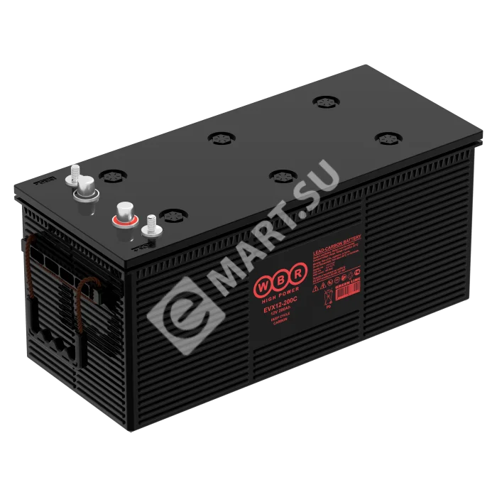Аккумулятор WBR EVX12-200C - герметизированная, выполненная по технологии AGM, карбоновая свинцово-кислотная аккумуляторная батарея. Обладает высоким качеством и надежностью, устойчивы к глубоким разрядам и применяются для питания электрических транспортных средств, гольфкаров, газонокосилок, полотерных и поломоечных машин, медицинских колясок и другой техники.